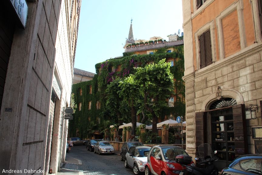 Beeindruckend bewachsene Fassade des Hotel Raphael am Largo Febo