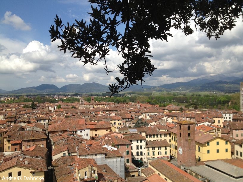 Blick Richtung Westen vom Torre Guinigi auf Lucca. Mit dem Torre dell'Orologio.