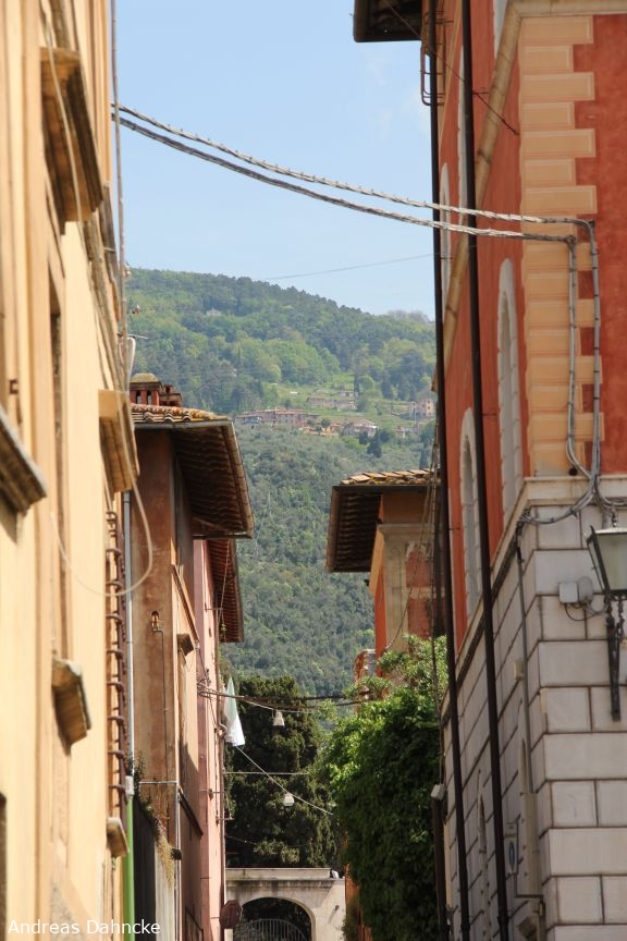Blick durch die Gassen auf die umliegenden Hügel der Toskana