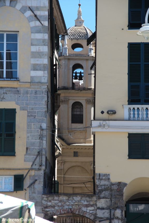 Glockenturm der San Pietro in Banchi druch die schmale Gasse Piazza de Marini gesehen.