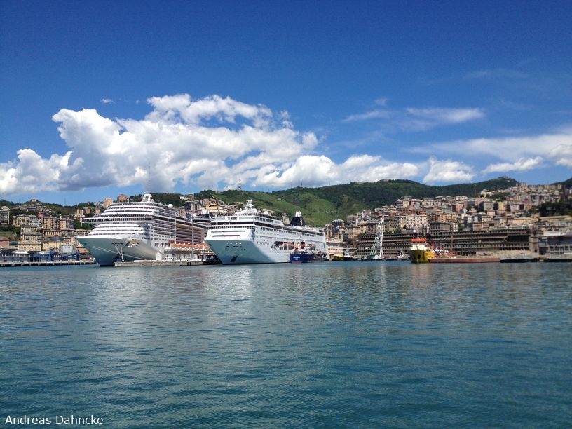 Im historischen Hafens Genuas mit Kreuzfahrtterminal und Schiffen