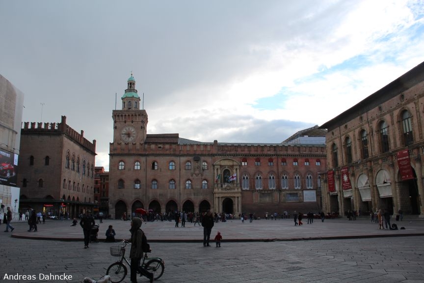 Die Piazza Maggiore mit dem Palazzo d'Accursio (mit der Turmuhr) und dem Palazzo Comunale (Eingang mit Flaggen)