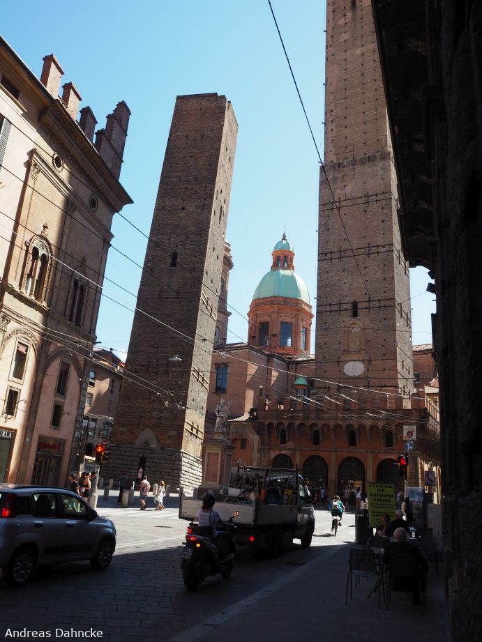 Die beiden Geschlechtertürme Garisenda (Links) und Asinelli (Rechts) und in der Mitte die Chiesa dei Santi Bartolomeo e Gaetano