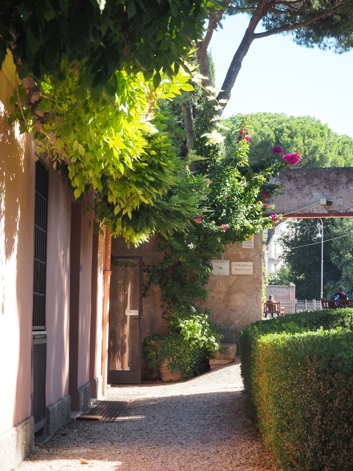 Auf einer Bank am Verwaltungsgebäude des Friedhofs