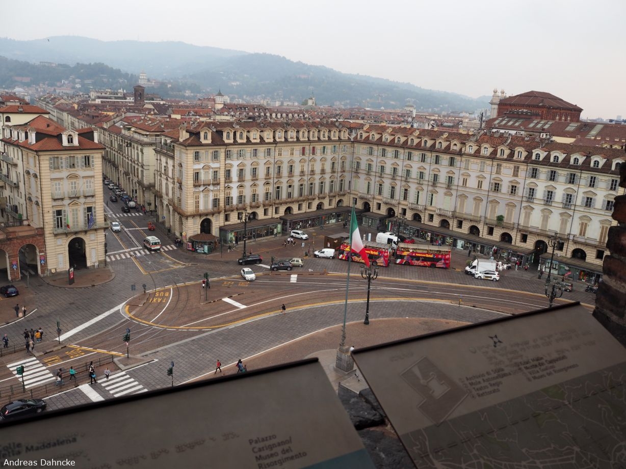 Blick gen Südosten auf die Piazza Castello und den Anfang der Via Po vom Palazzo Madama