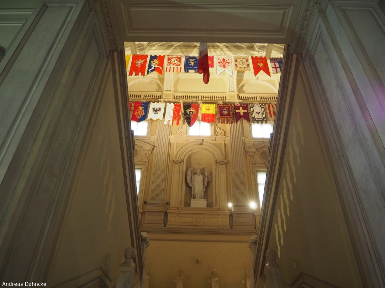 Treppenhaus am Eingang des Museum Nazionale del Risorgimento Italiano im Palazzo Carignano mit den Flaggen der italienischen Regionen