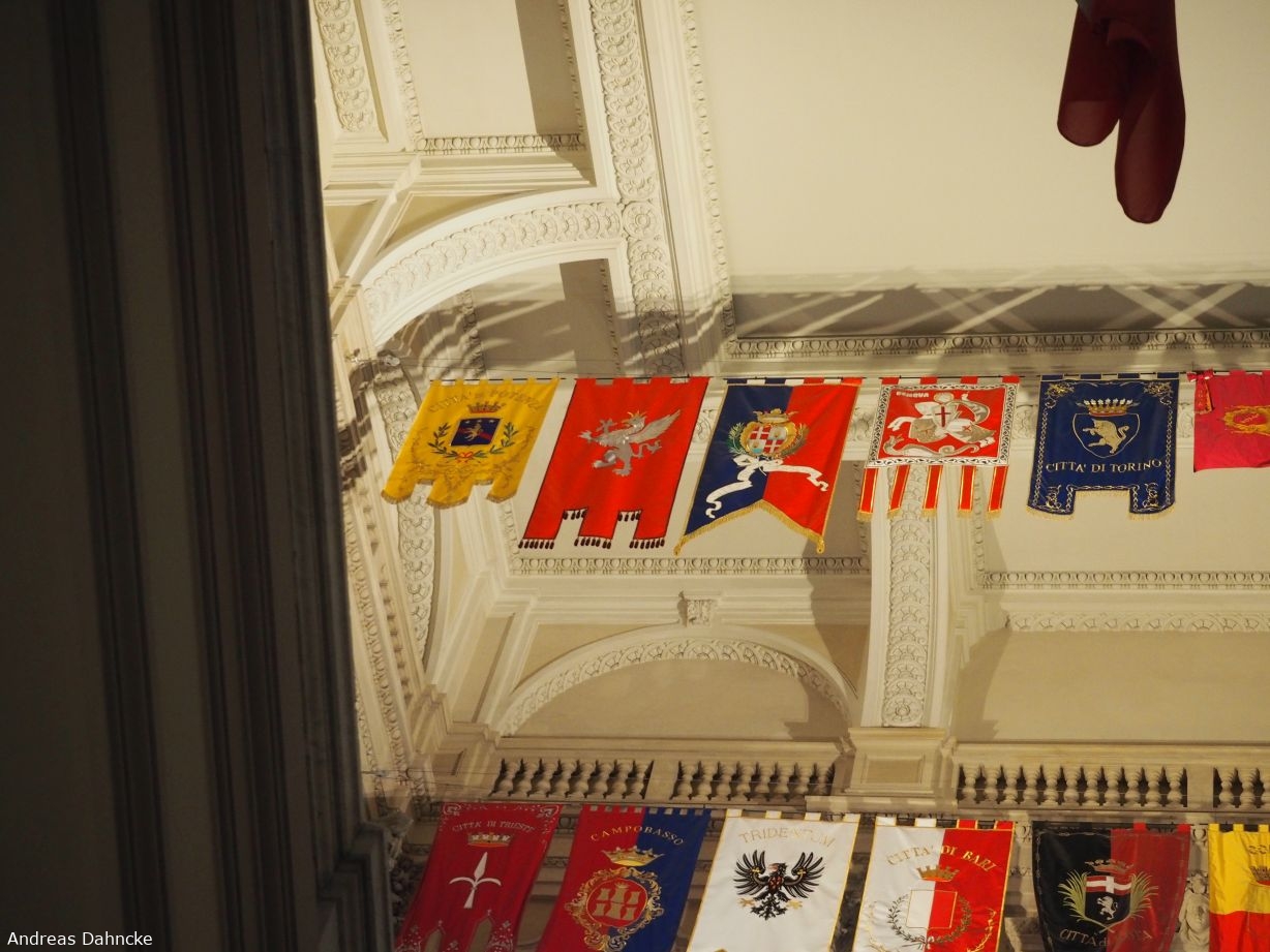 Treppenhaus am Eingang des Museum Nazionale del Risorgimento Italiano im Palazzo Carignano mit den Flaggen der italienischen Regionen