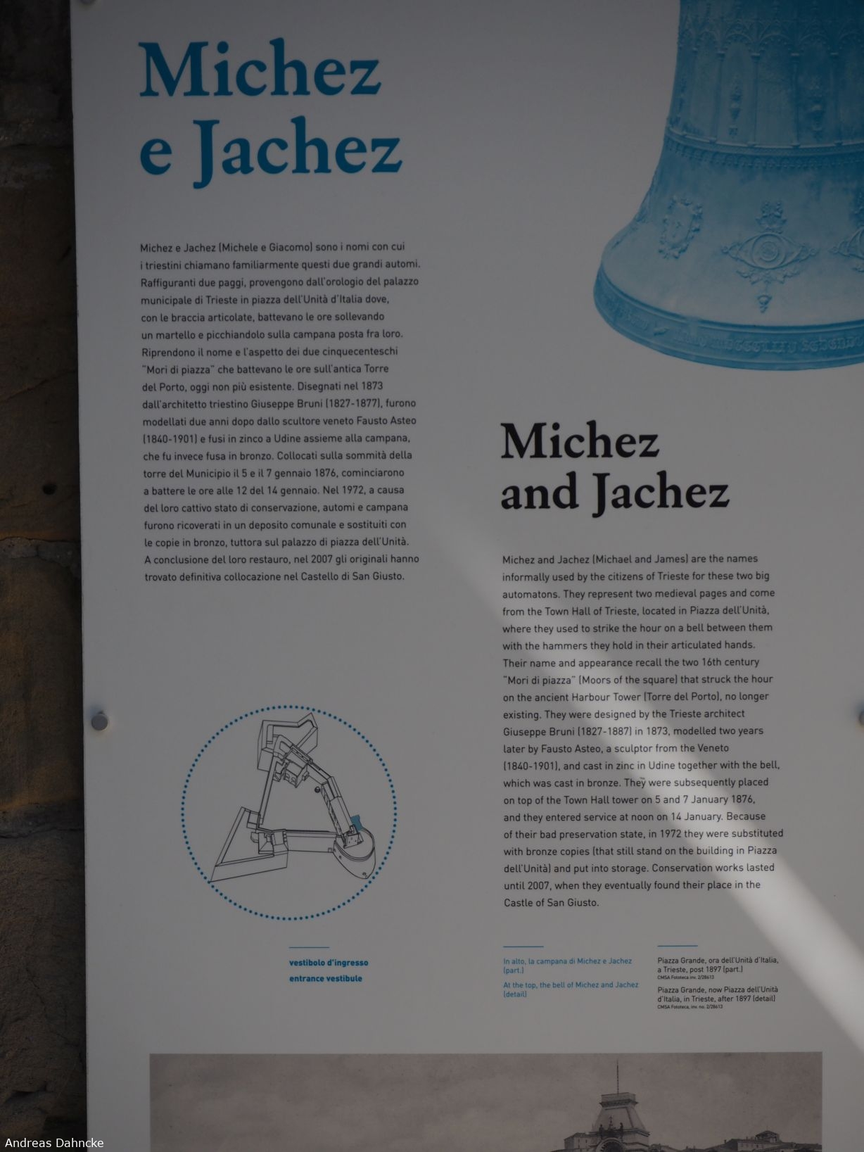 Infotafel zu Michez e Jachez im Castello di San Giusto, Trieste