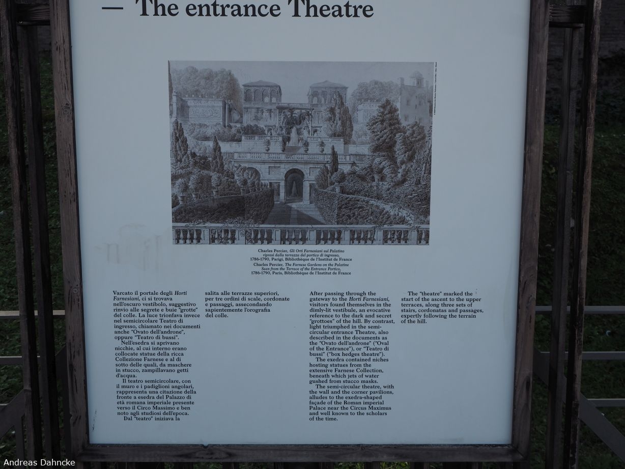 Foro Romano: Infoschild Theatereingang (Teatro del Fontanone) bzw. Zugang zu den Farnesichen Gärten (Uccelliere Farnesiane)
