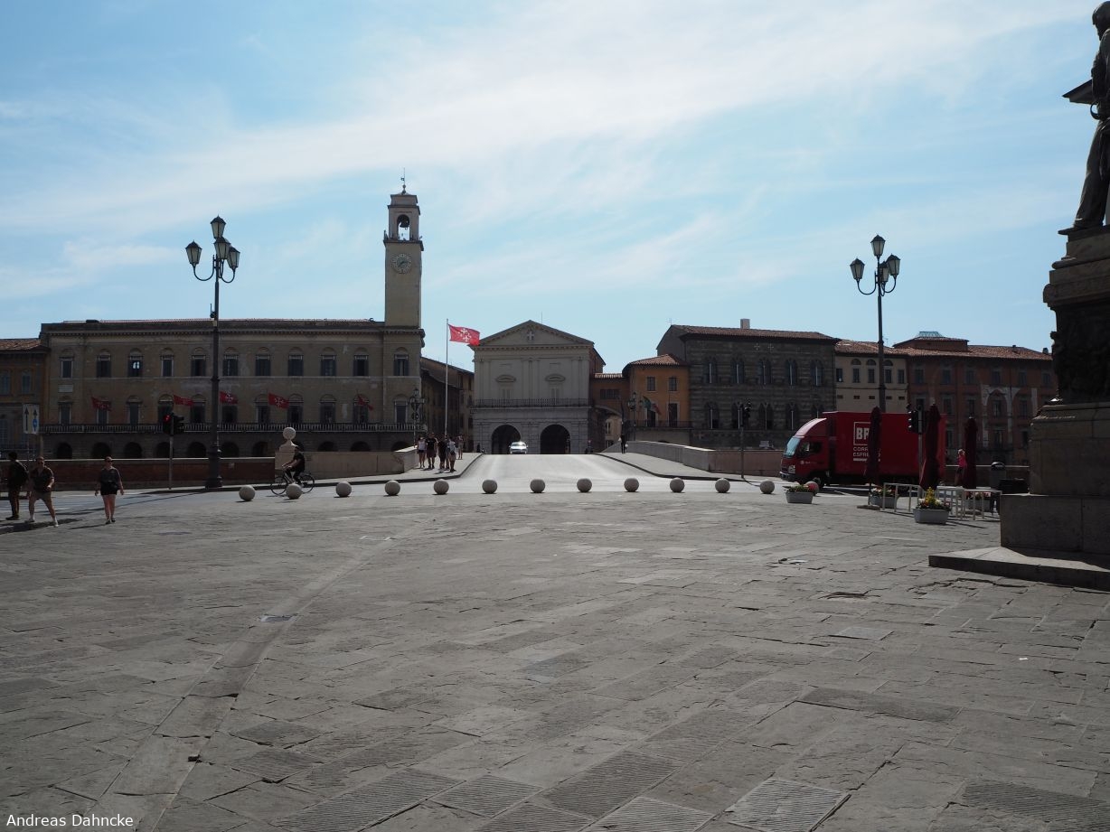 Auf der Piazza Garibaldi mit Blick über die Ponte di Mezzo auf Palazzo Pretorio und Logge dei Banchi