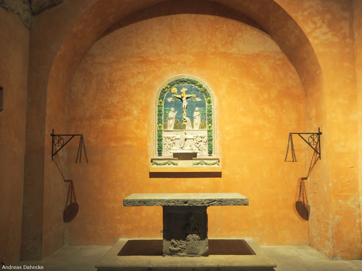 Benedetto Buglioni: Altar und Keramikrelief mit der Kreuzigung Christi und dem Blutwunder (hinten), 1496, in der Basilica di Santa Cristina