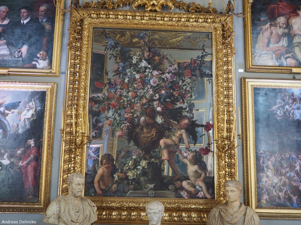 Galleria Colonna/Palazzo Colonna: Bemalter Spiegel mit holzbilderrahmen und drei Putten. 1660. Carlo Maratta e Mario dei Fiori im Sala Grande (Großer Saal)