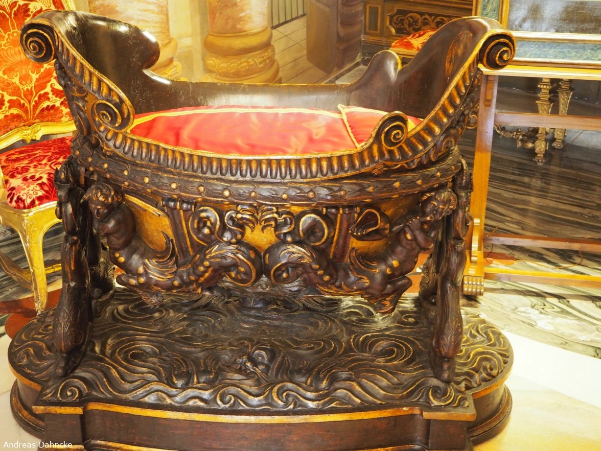 Galleria Colonna/Palazzo Colonna: Appartamento della Principessa Isabelle - Sala delle Feste: Zeremonielle Wiege aus Holz
