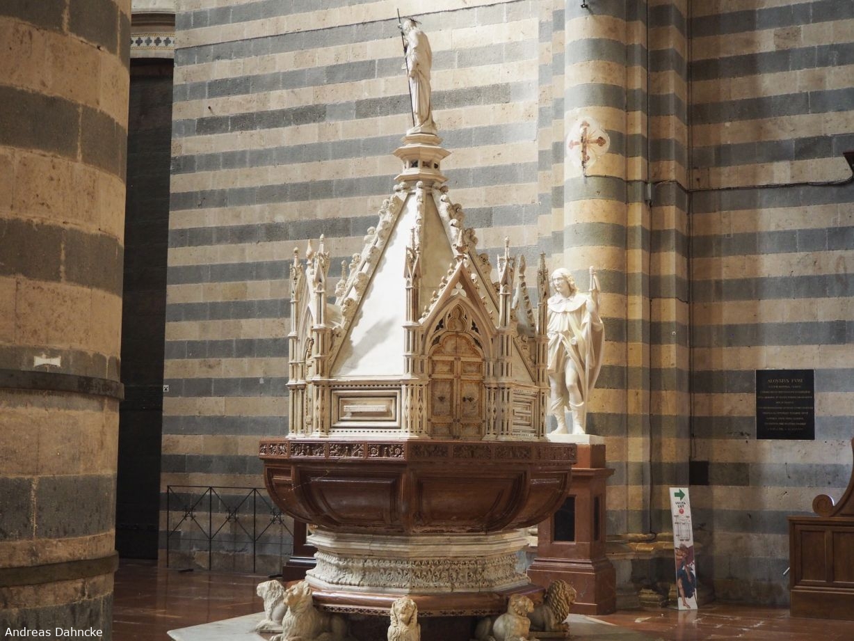 Gotische Taufbecken aus Marmor mit Löwen der italienischen gotischen Kathedrale Santa Maria Assunta im Duomo di Orvieto