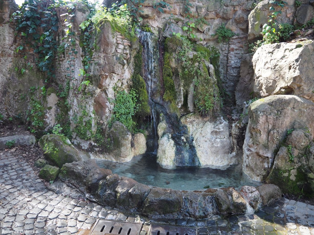 Kleiner Wasserfall an der Kreuzung Viale delle due Piramidi/Viale Antonino e Faustina in der Villa Borghese