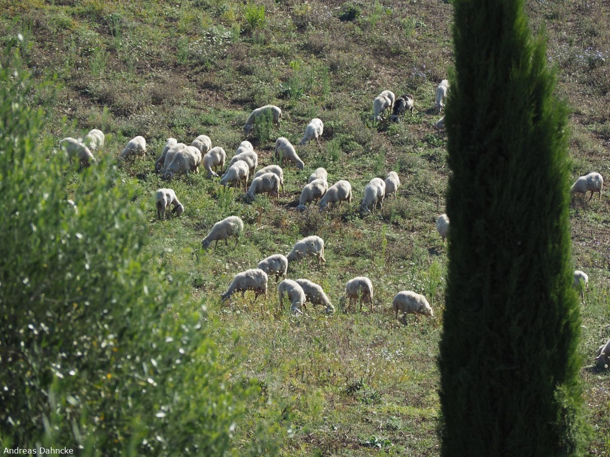 Ausblick von unserer Terrasse auf eine Schafsherde im Spa Resort Fonte Alla Lepre