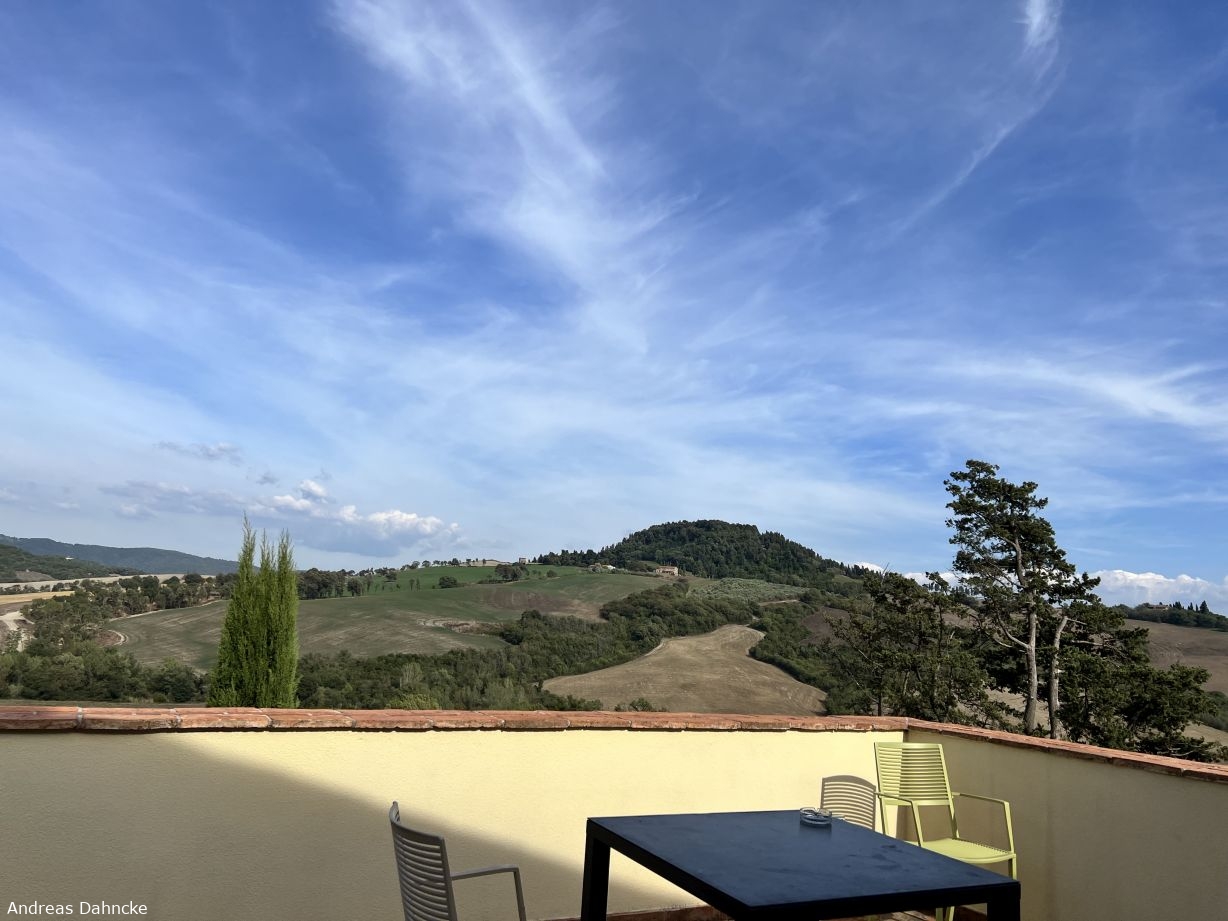 Ausblick von unserer Terrasse im Spa Resort Fonte Alla Lepre auf den Hügel im Osten mit Casaglia