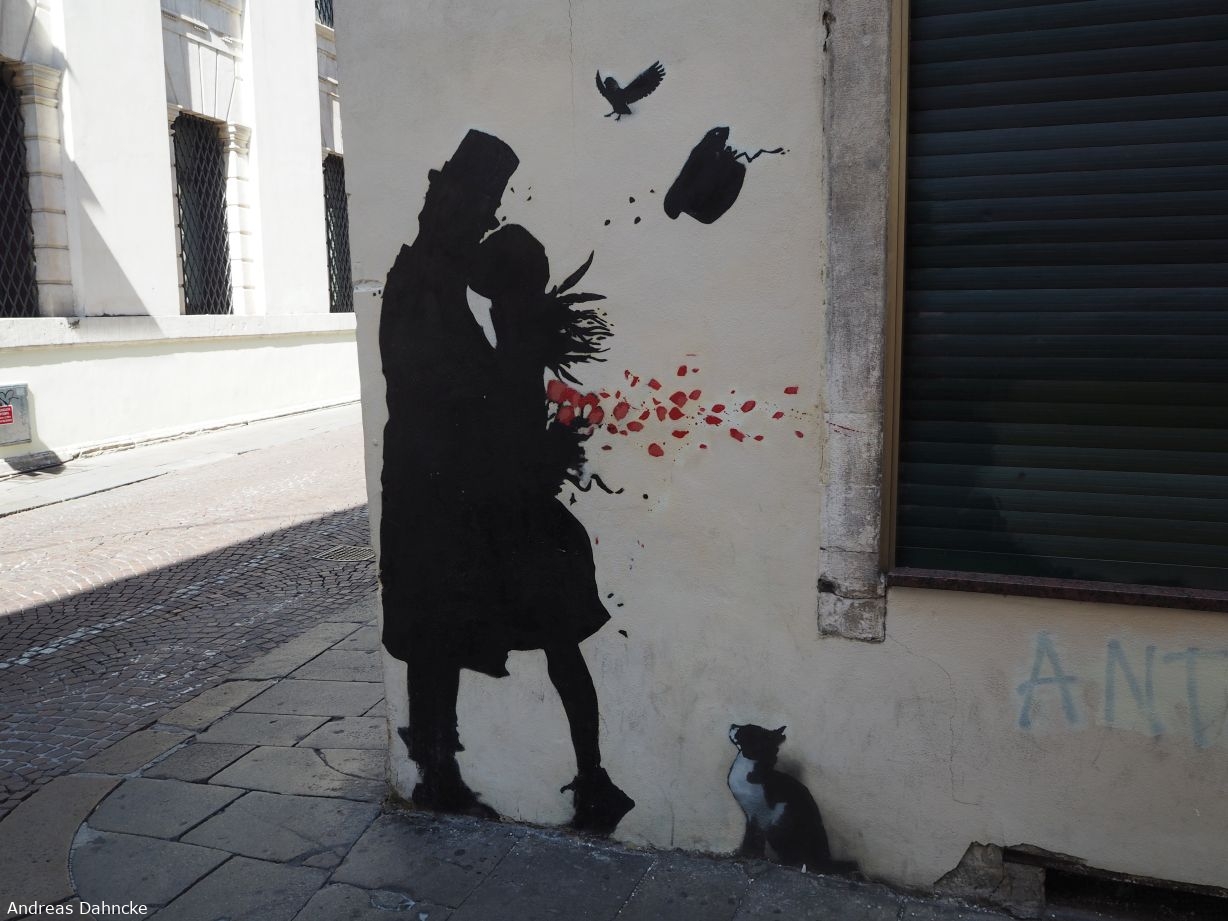Wandgemälde The Kiss von Kenny Random an der Ecke Via Daniele Manin und der Via Monte di Pietà