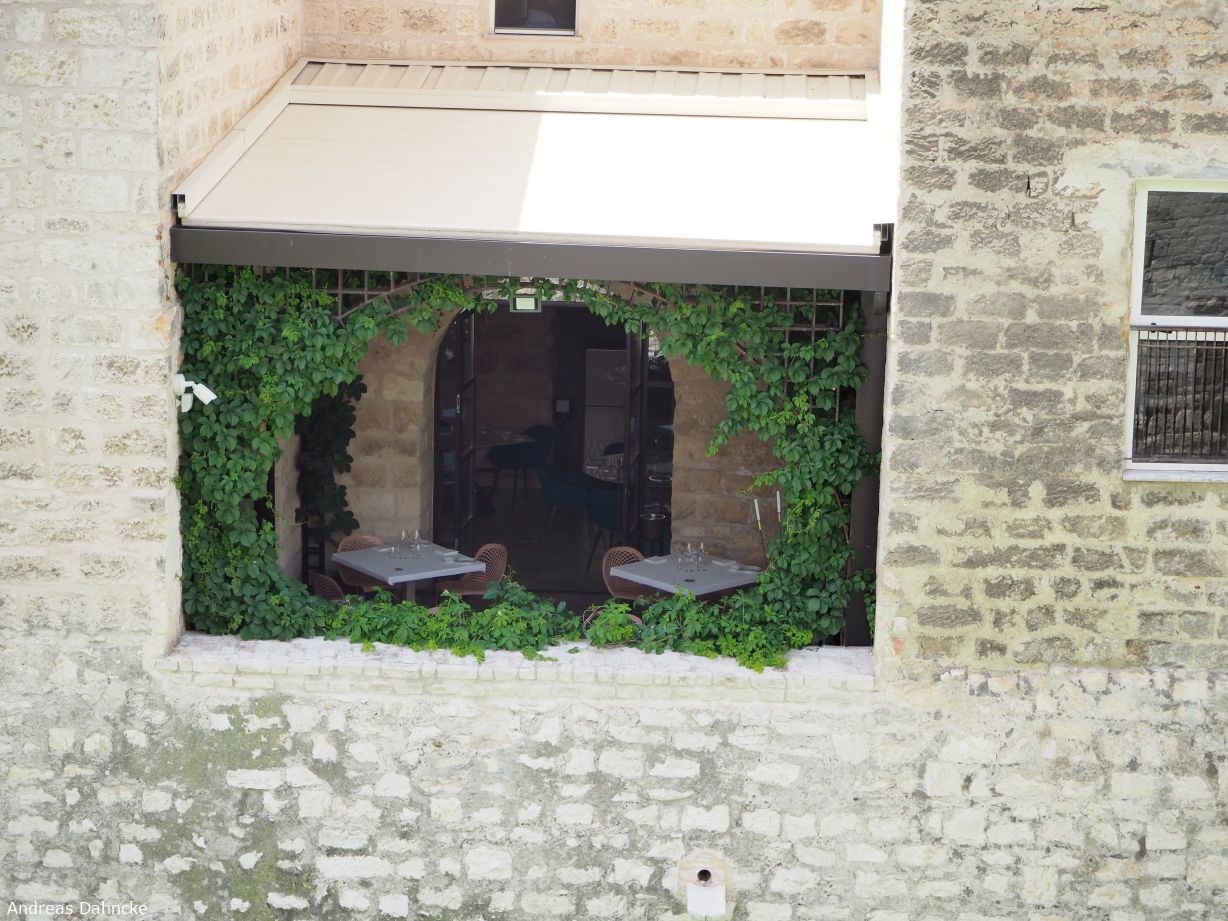 Balkon eines Resaurant gegenüber der Castello Svevo di Trani