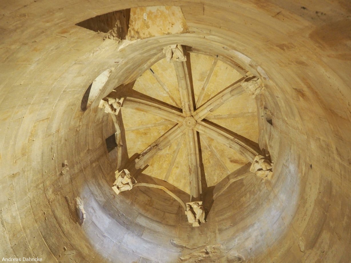 Sechsteiliges Deckengewölbe in einem der acht Türme des Castel del Monte. Die Kragsteine sind als Atlanten (nackte Männer) gestaltet